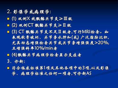 ?疾病早期疼痛多在一侧呈间断性,数月后疼痛多在双侧呈持续性。随病情进展病变由骶髂关节向腰椎、胸颈椎发展,则出现相应部位疼痛、活动受限或脊柱畸形。据报道,我国患者中大约45%的患者是从外周关节炎开始发病。 24%~75%的AS患者在病初或病程中出现外周关节病变,以膝、髋、踝和肩关节居多,肘及手和足小关节偶有受累。非对称性、少数关节或单关节,及下肢大关节的关节炎为本病外周关节炎的特征。我国患者除髋关节外,膝和其他关节的关节炎或关节痛多为暂时性,极少或几乎不引起关节破坏和残疾。髋关节受累占38%~66%,表现为局部疼痛,活动受限,屈曲孪缩及关节强直,其中大多数为双侧,而且94%的髋部症状起于发病后头5年内。发病年龄小,及以外周关节起病者易发生髋关节病变。 本病的全身表现一般不重,少数重症者有发热、疲倦、消瘦、贫血或其他器官受累。跖底筋膜炎、跟腱炎和其他部位的肌腱末端病在本病常见。1/4的患者在病程中发生眼色素膜炎,单侧或双侧交替,一般可自行缓解,反复发作可致视力障碍。神经系统症状来自压迫性脊神经炎或坐骨神经痛、椎骨骨折或不全脱位以及马尾综合征,后者可引起阳萎、夜间尿失禁、膀胱和直肠感觉迟钝、踝反射消失。