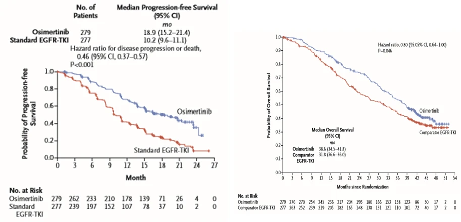 第三代EGFR-TKI在作用于敏感突变的同时,也可以克服第一代和第二代EGFR TKI治疗后出现的EGFR突变,对中枢神经系统(CNS)的治疗也显示出良好的效果转移。第三代EGFR TKI的PFS获益和总生存期(OS)获益优于第一代药物。中位 PFS 延长 8.7 个月(18.9 个月 vs. 10.2 个月,HR=0.46),OS 延长< @6.8 个月(38.6 个月 vs 31.8 个月,HR =0.80)2、3.