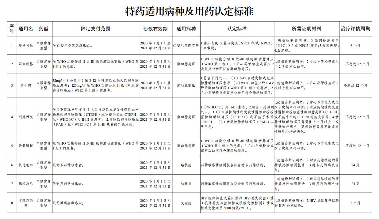 这18种特药包括用于治疗肺动脉高压的波生坦、利奥西呱,治疗结核病的贝达喹啉、德拉马尼,治疗类风湿性关节炎、强直脊柱炎、斑块状银屑病的阿达木单抗、英夫利昔单抗等药品。医疗机构按照目前执行的谈判药品特药备案要求,实行“定患者、定医院、定医师”三定管理,患者在指定的医疗机构由指定责任医师备案后可进行医保支付。